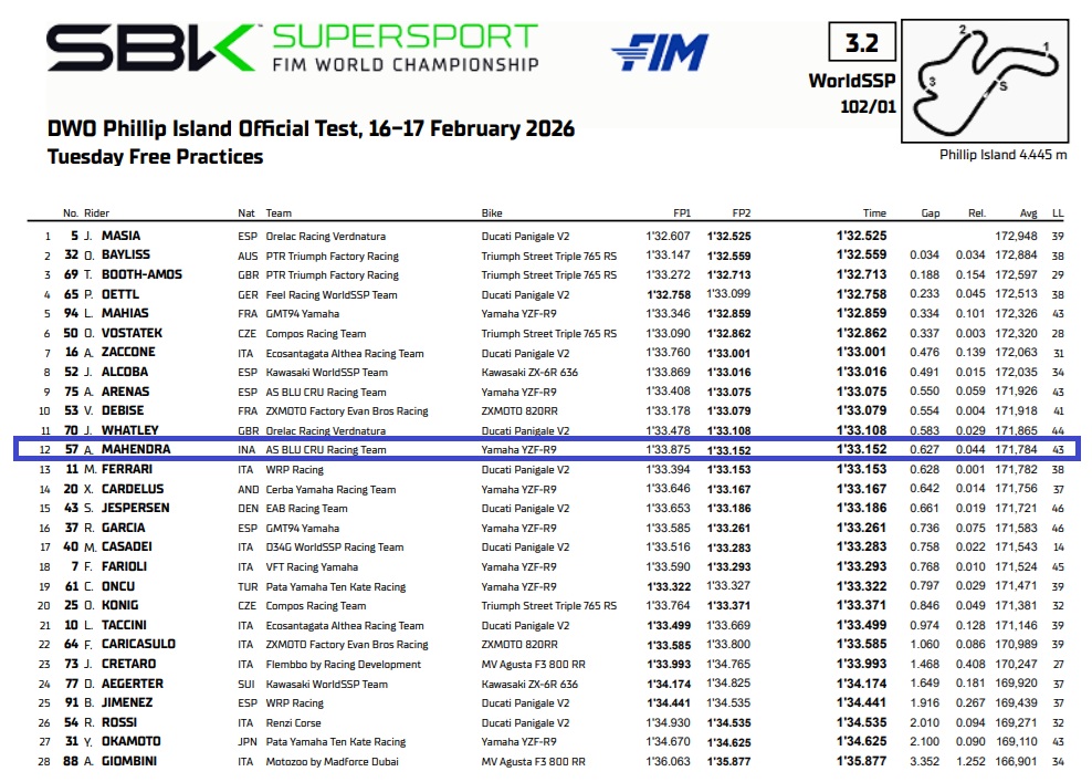Aldi Satya Mahendra berada di posisi 12  dari 28 pebalap yang ikut hari kedua DWO Phillip Island Official Test WorldSSP. Pebalap binaan Yamaha Racing Indonesia ini mencatat waktu 1’33.152 detik di sesi terakhir atau sore.