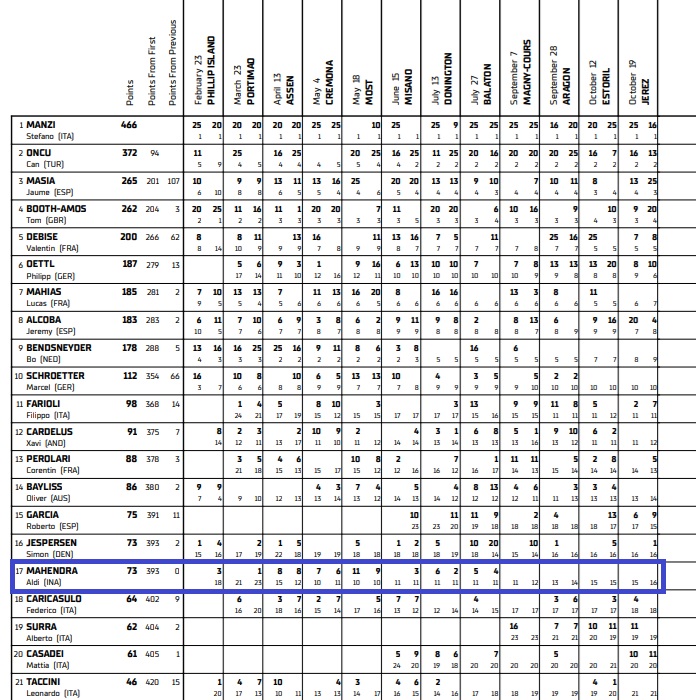 Perjuangan Aldi Satya Mahendra pebalap Yamaha BLU CRU Evan Bros Team di World Supersport 2025 berakhir juga. Aldi Satya Mahendra sebagai rookie di balap World Supersport menempati posisi 17 klasemen dari 32 pebalap World Supersport 2025
