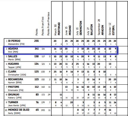 Arai Agaska sendiri di R3 BLU CRU World Cup 2025 pebalap produktif. Sebanyak 12 race hanya satu race tanpa poin sisanya mendapatkan poin.