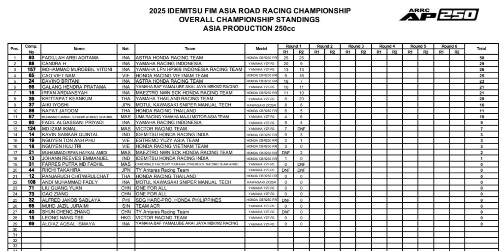 Dari 5 kelas yang dilombakan di ARRC 2025 round 1 (TVS OMC, UB150, AP250, SS600, ASB1000) para pebalap Indonesia dominasi di kelas UB150, AP250 dan SS600. Di kelas tersebut pebalap Indonesia memimpin klasemen sementara pebalap.