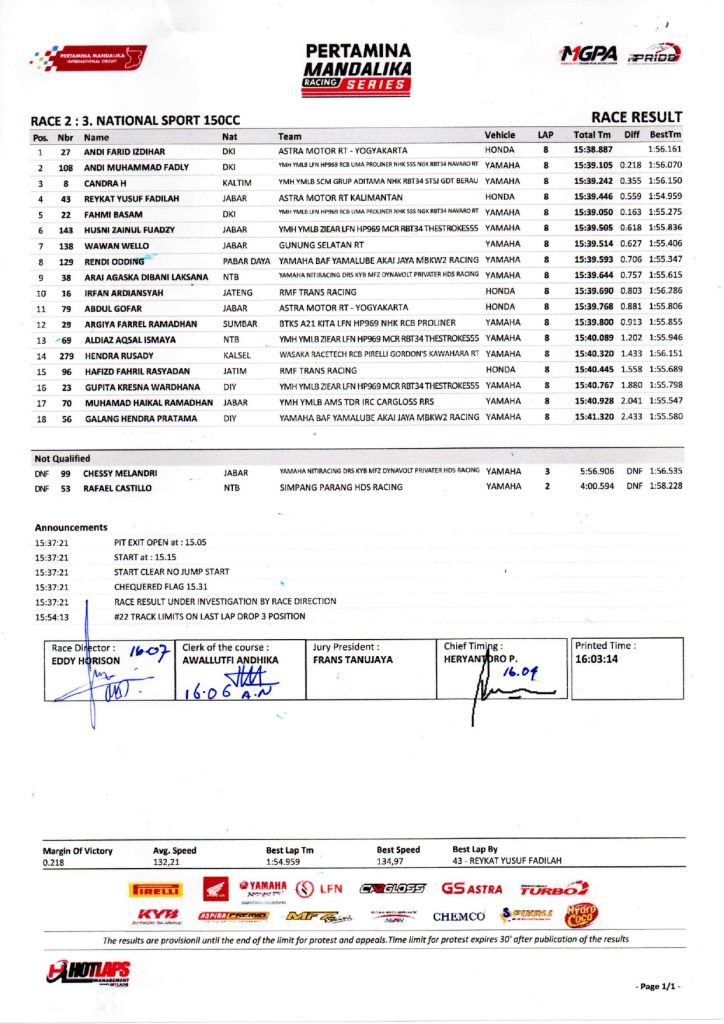 Kelas National Sport 150cc Andi Farid Izdihar menjadi juara race 2 Kejurnas Pertamina Mandalika Racing Series. Sebelumnya di race pertama Pebalap Astra Motor Racing Team ini juga juara.