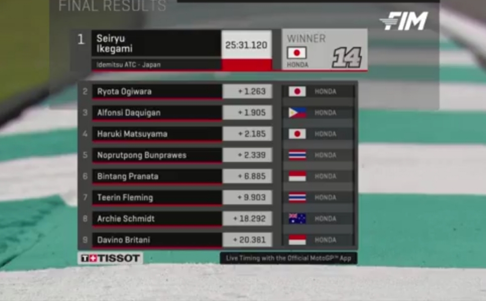 Sementara pebalap reguler IATC dari Indonesia ada Davino Britani yang start ke 8 finish ke 9.