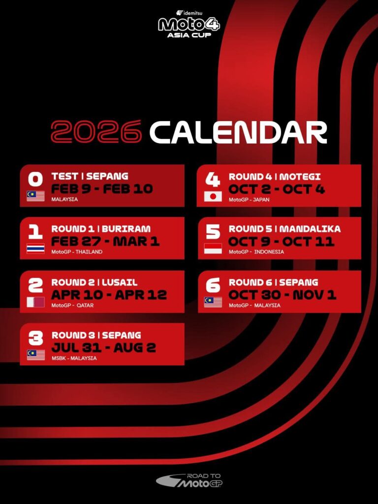 Kejuaraan Idemitsu Moto4 Asia Cup 2026 akan segera dimulai. Balap Road to MotoGP ini akan dilaksanakan Jumat hingga Minggu 27 Februari sampai 1 Maret 2026 di Chang International Circuit di Buriram Thailand.