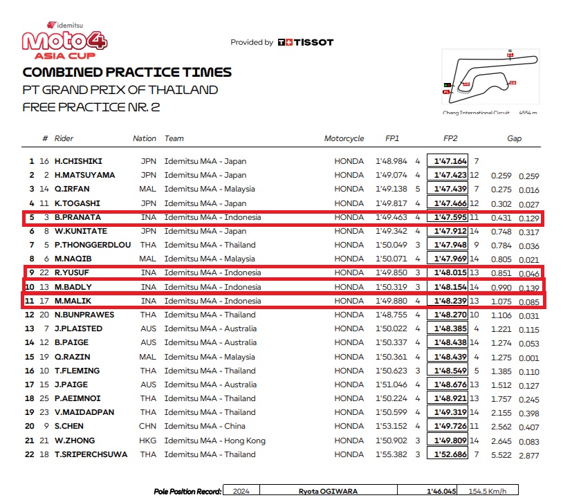 Keempat rider Indonesia di Idemitsu Moto4 Asia Cup ini berada di sebelas besar waktu gabungan sesi FP. Bintang Pranata Sukma menjadi pebalap Indonesia yang menempati posisi teratas di peringkat 5 dari 22 pebalap peserta Moto4 Asia Cup di seri 1 Tahiland ini.