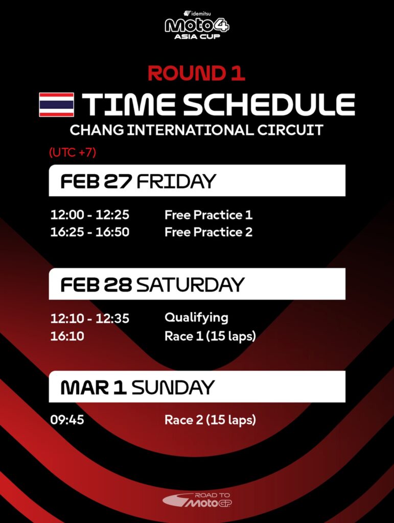 Seri pertama Idemitsu Moto4 Asia Cup musim ini digelar sebanyak dua kali di Chang International Circuit, Buriram, Thailand pada Sabtu (28/2/2026) dan Minggu (1/3/2025) masing-masing pukul 16:10 WIB dan 09:45 WIB serta dapat disaksikan pada channel Youtube Idemitsu Moto4 Asia Cup.
