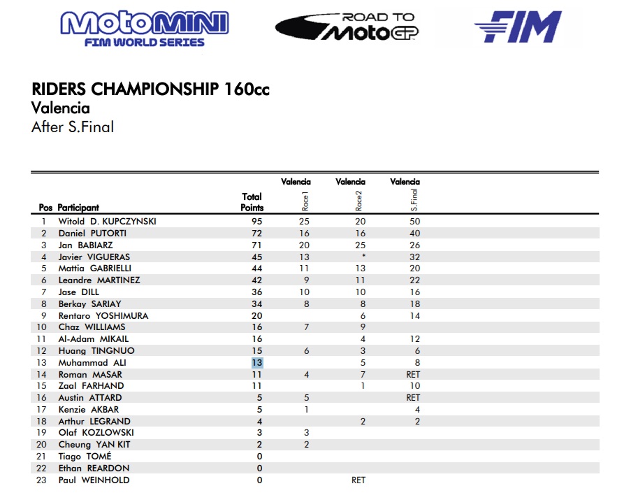 Standing akhir kelas 160cc Muhammad Ali menempati peringkat 13 dengan 13 poin. Kenzie Akbar berada diperingkat 17 dengan 5 poin.