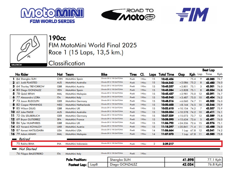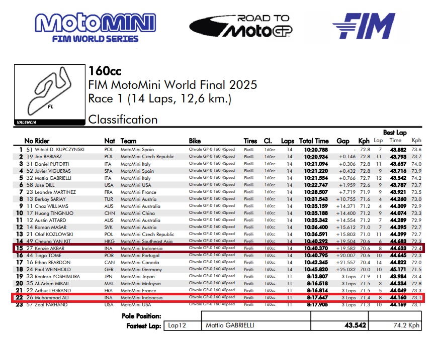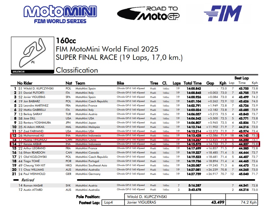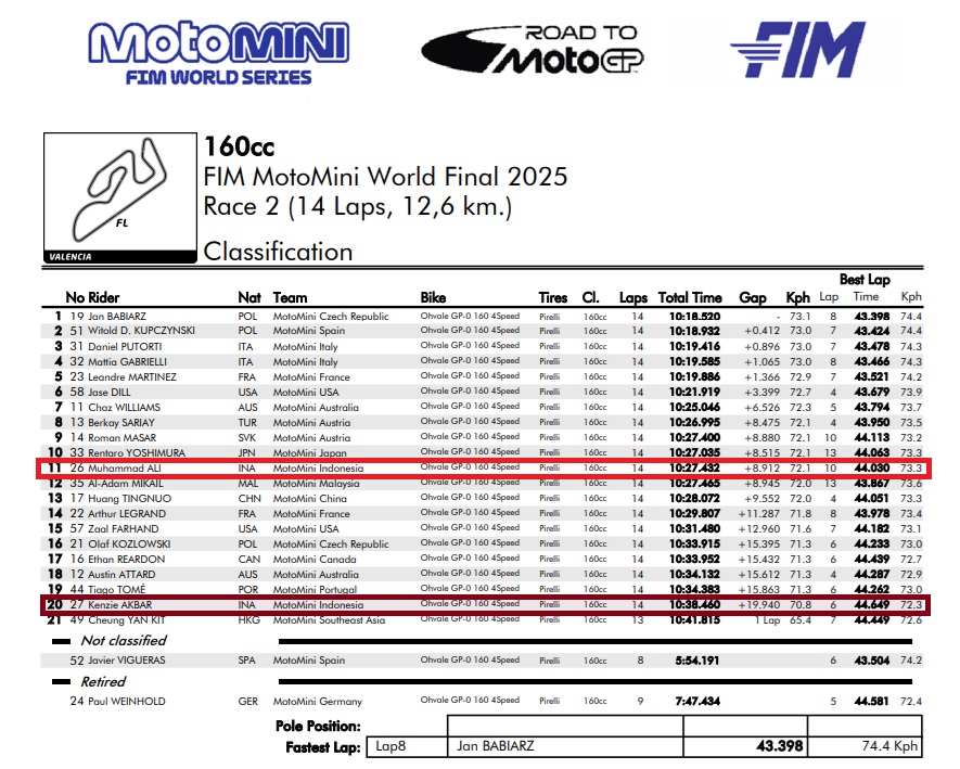 Race FIM Motomini World Series Final 2025 berlangsung pada 13 November 2025, tiga pebalap Indonesia turut serta. Di kelas 160cc dua rider tanah air yaitu Muhammad Ali dan Kenzia Akbar memberi perlawanan yang ketat.