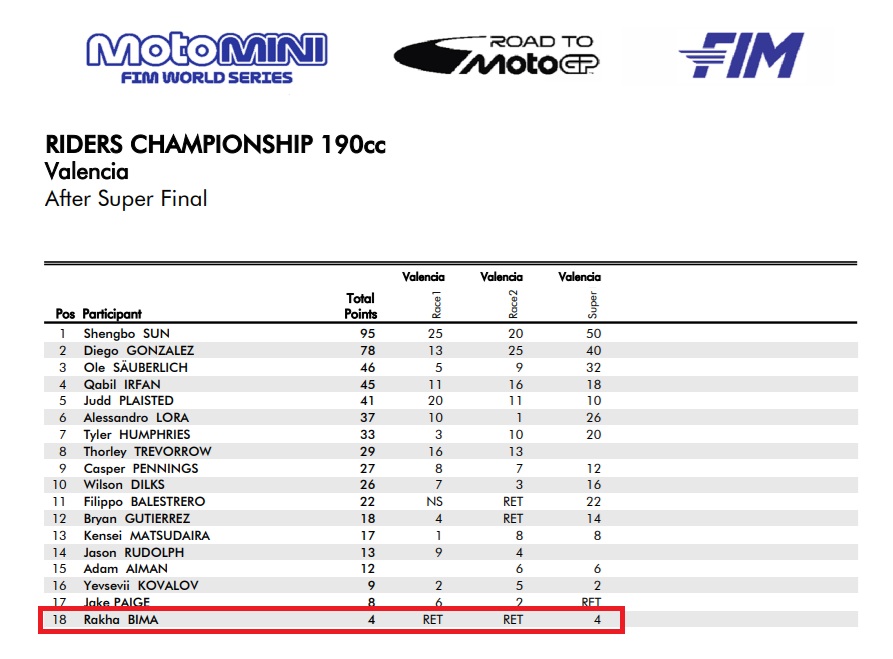 Rakha Bima pebalap tanah air yang balap di kelas 190cc race 1 dan race 2 tidak berhasil raih poin. Sedang pada Super final race Rakha Bima finish ke 14 dan mendapat 4 poin dan berada di posisi 18 klasemen akhir.