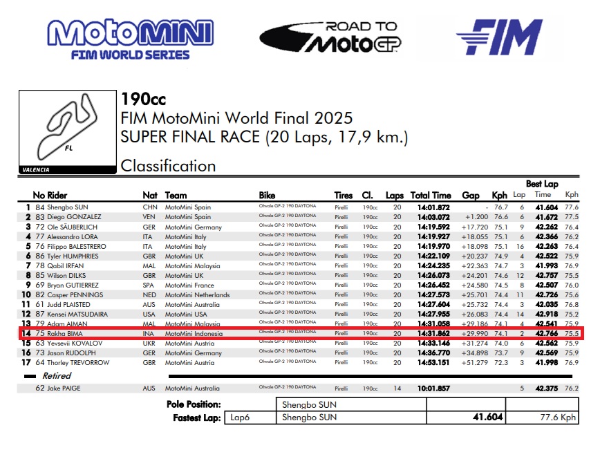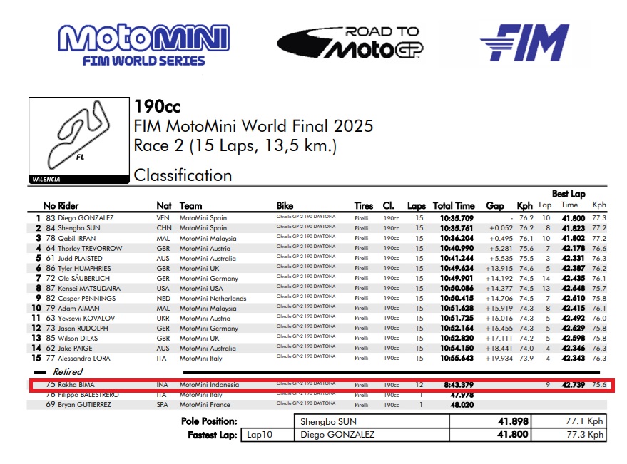 FIM Motomini World Series Final 2025 berlangsung di Valencia 11-13 November 2025. Para pebalap Indonesia terpilih dari FIM MiniGP Indonesia Series telah berjuang untuk meraih hasil terbaik di setiap sesi yang dilangsungkan.