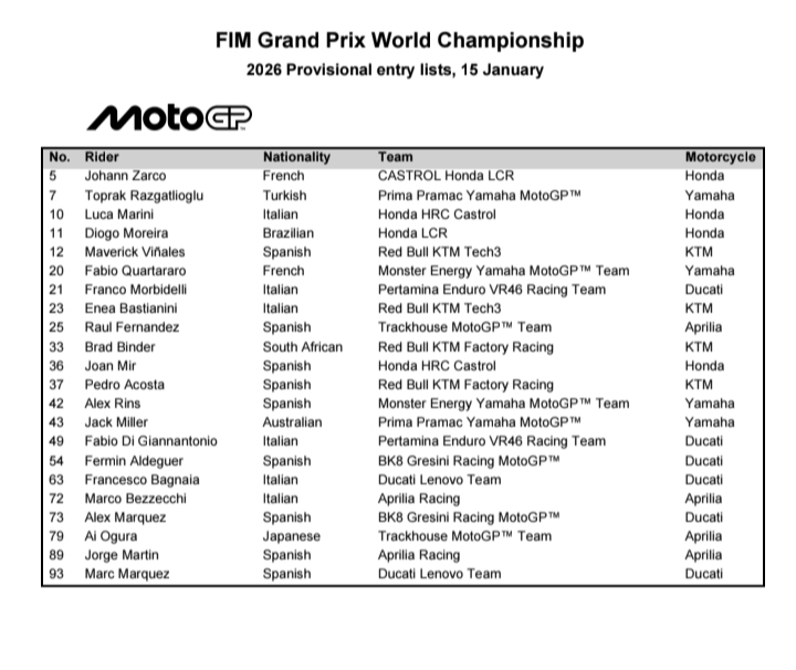 Semakin dekat putaran perdana MotoGP 2026 ini, FIM mengumumkan provisional Entry List untuk 2026 FIM Grand Prix World Championship (15/1).