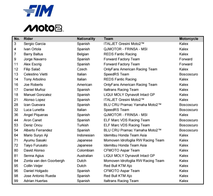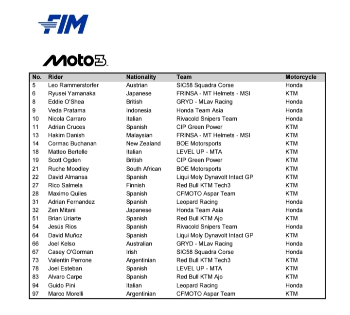 Entry list pebalap kelas MotoGP, Moto2 dan Moto3 dari nomor start, negara, tim dan motor yang dipakai diinfokan