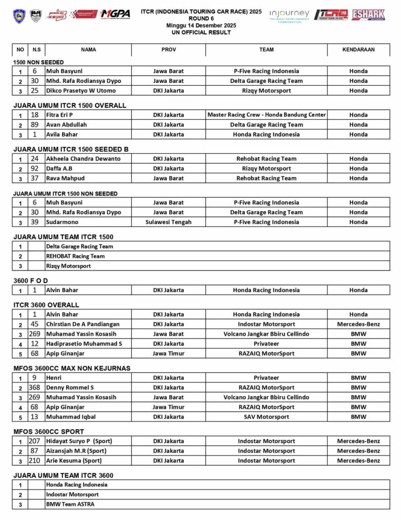 “Putaran Final ITCR di Mandalika menunjukkan betapa kompetitifnya balap nasional kita saat ini. Persaingan di setiap kelas sangat ketat, baik di ITCR 1200, ITCR 1500, maupun ITCR 3600. Ini mencerminkan kualitas pembalap, kesiapan tim, serta standar penyelenggaraan yang semakin baik,” ujar Priandhi Satria.