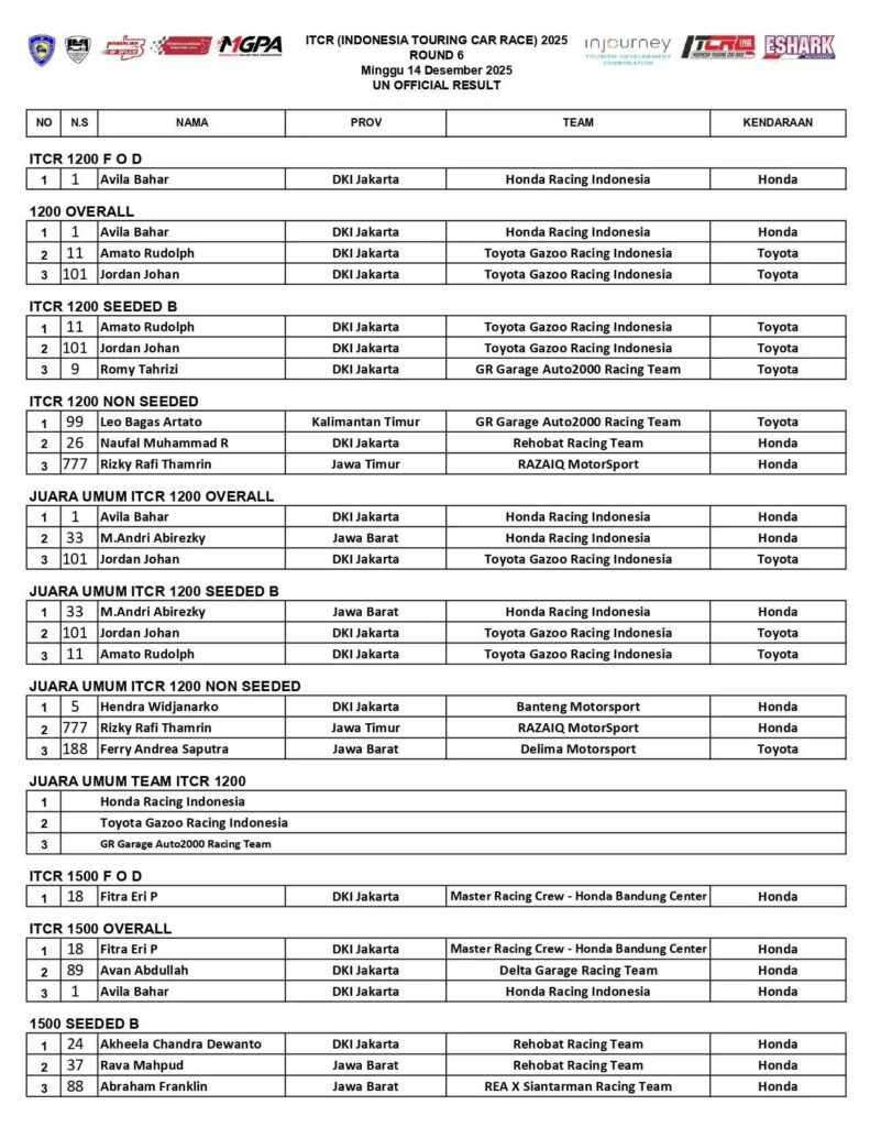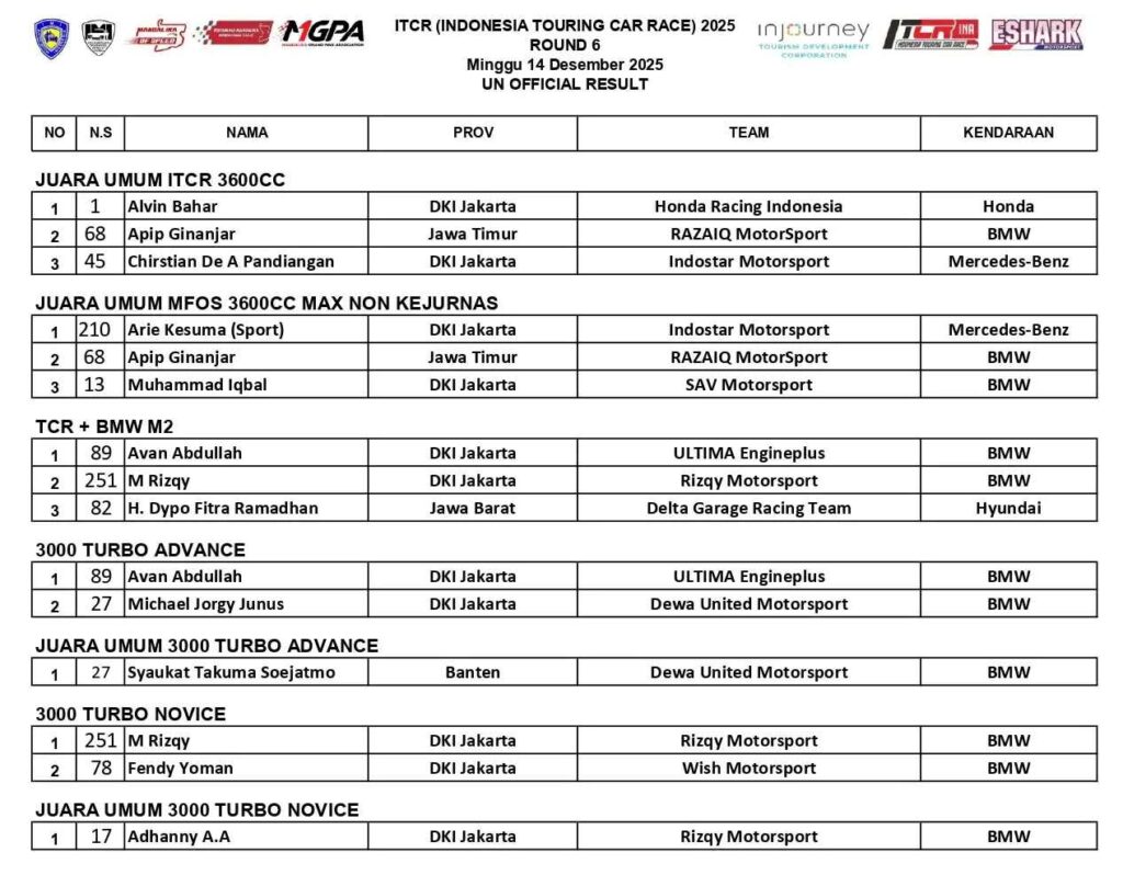Kejurnas Indonesia Touring Car Race (ITCR) 2025 Putaran Final yang digelar pada Minggu, 14 Desember 2025, di Pertamina Mandalika International Circuit berlangsung sengit. Pasalnya putaran akhir ini tidak hanya menentukan hasil seri terakhir, tetapi juga berpengaruh besar terhadap klasemen juara umum pembalap dan tim pada musim ITCR 2025.