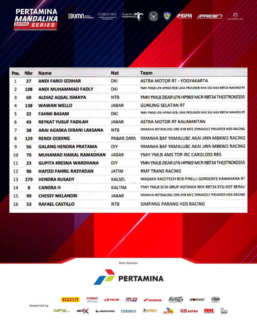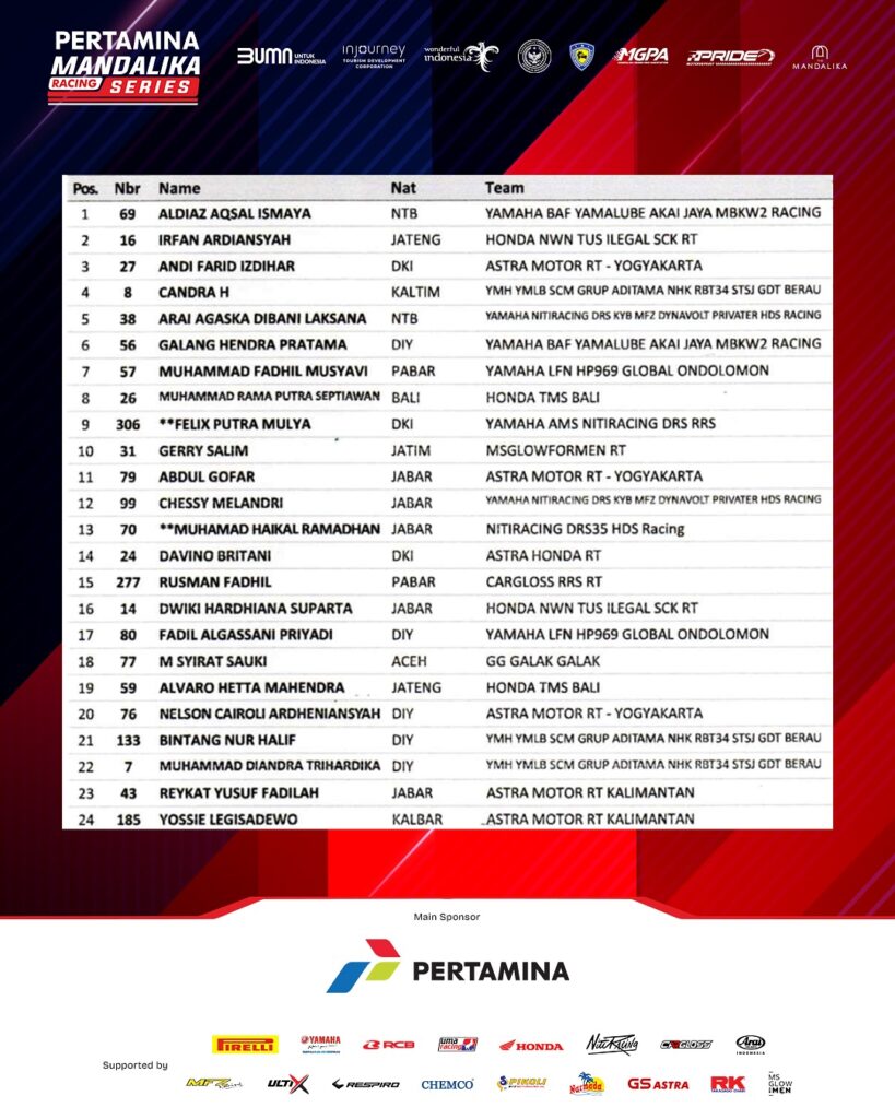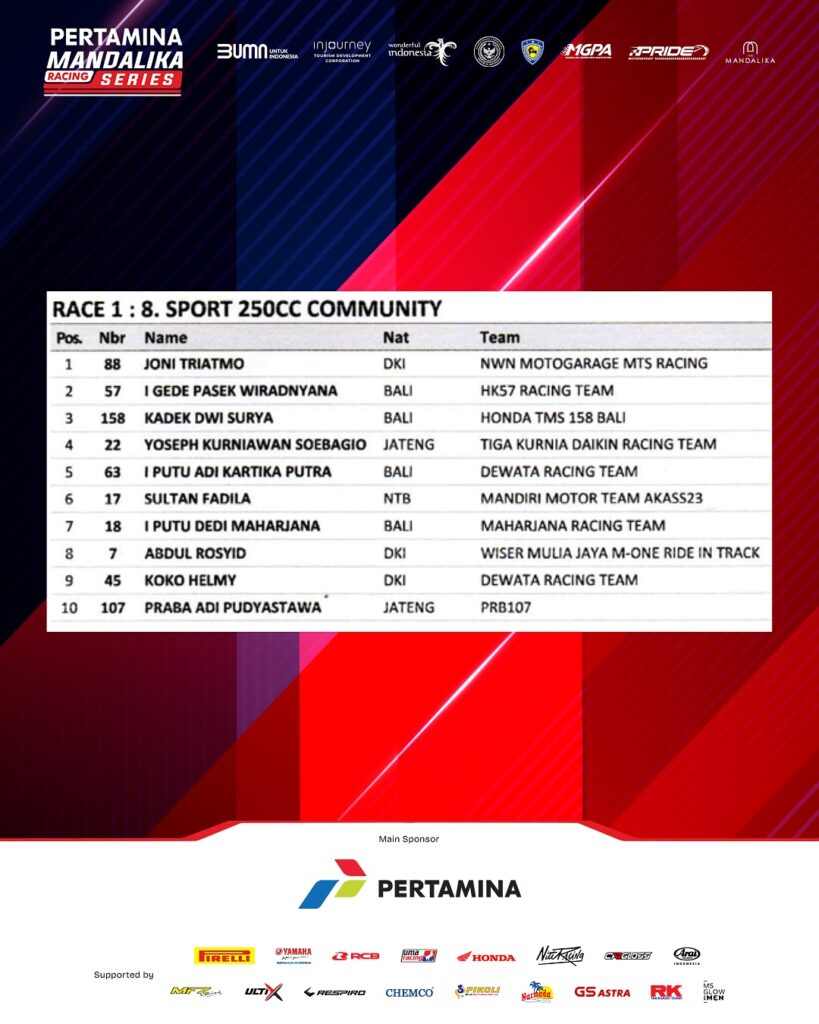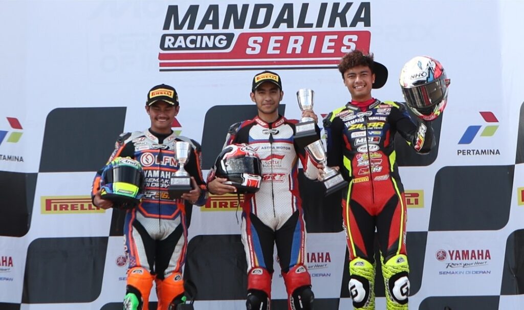 Race 1 Kejuaraan Nasional Balap Motor Sportbike Pertamina Mandalika Racing Series putaran kelima di Pertamina Mandalika International Circuit, Lombok berlangsung Sabtu 1 November 2025 baru saja selesai.