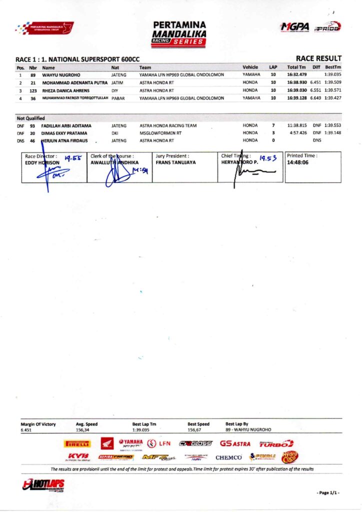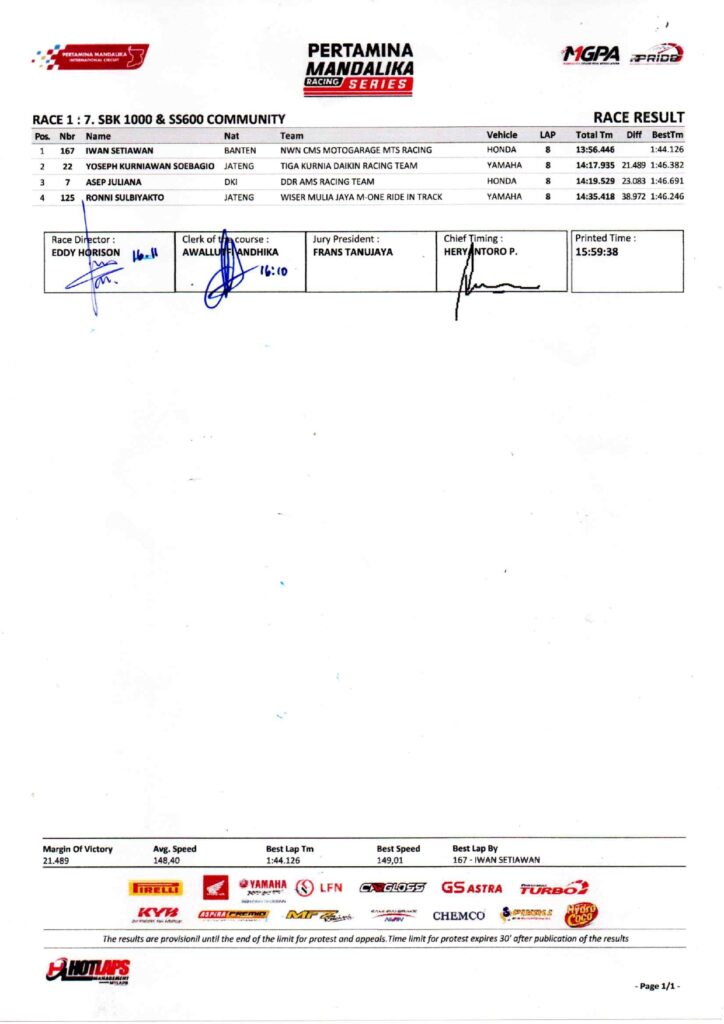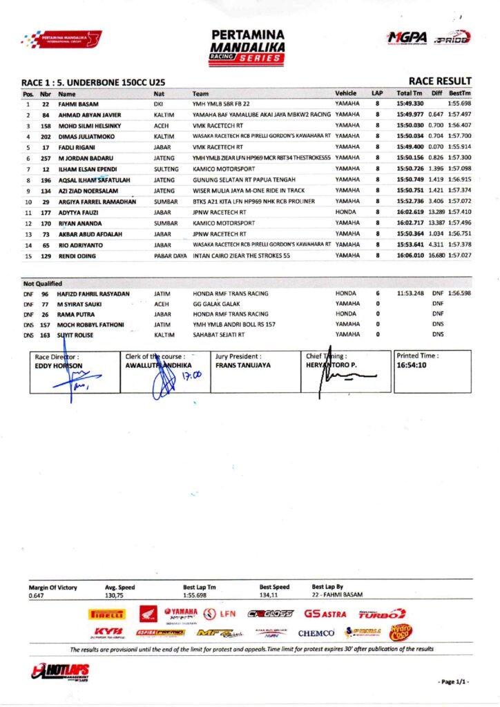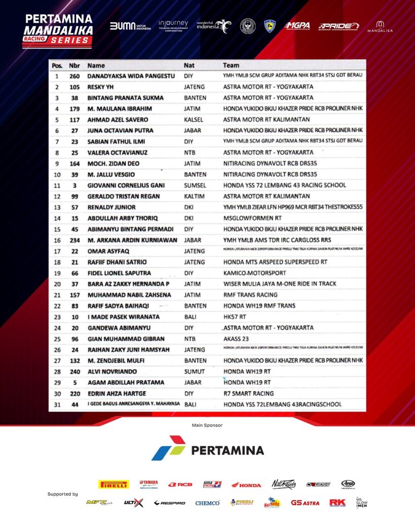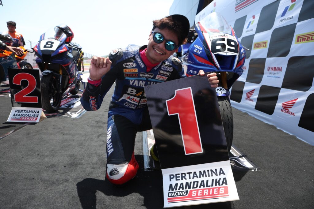 Race 1 Kejuaraan Nasional Balap Motor Sportbike Pertamina Mandalika Racing Series putaran kelima di Pertamina Mandalika International Circuit, Lombok berlangsung Sabtu 1 November 2025 baru saja selesai.