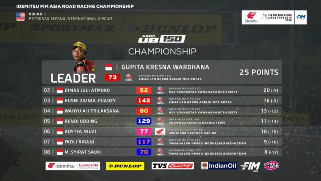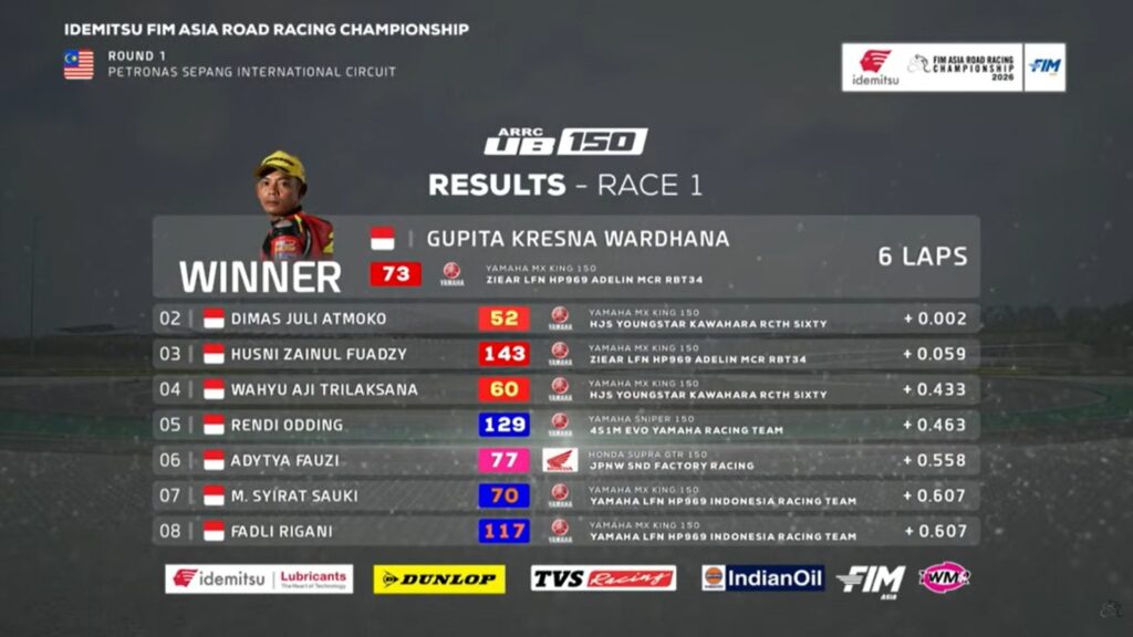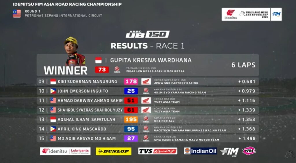 Finish dramatis race 1 kelas UB150 Asia Road Racing Championship (ARRC) 2026 seri 1 di Sepang International Circuit Malaysia Sabtu (11/4.). Dua pebalap terdepan hampir bersamaan masuk garis finish.