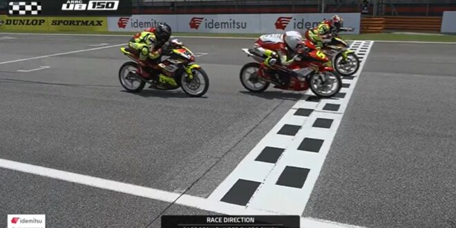 Finish dramatis race 1 kelas UB150 Asia Road Racing Championship (ARRC) 2026 seri 1 di Sepang International Circuit Malaysia Sabtu (11/4.). Dua pebalap terdepan hampir bersamaan masuk garis finish.