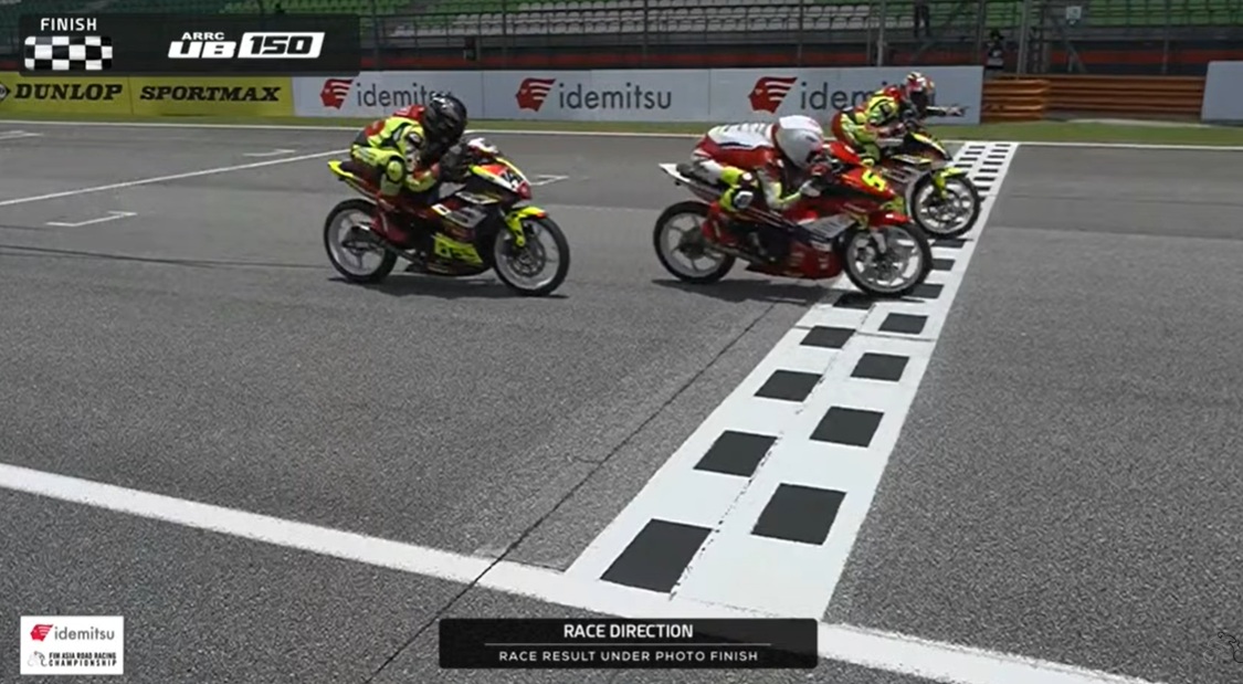 Finish dramatis race 1 kelas UB150 Asia Road Racing Championship (ARRC) 2026 seri 1 di Sepang International Circuit Malaysia Sabtu (11/4.). Dua pebalap terdepan hampir bersamaan masuk garis finish.