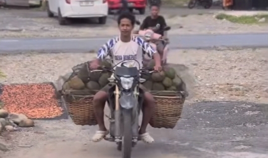 Durian yang dipanen ini dari kebun diangkut ke rumah. Muhammad Badly membantu membawanya dengan mengendarai motor.