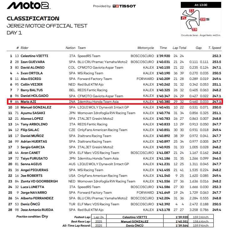 Tes hari pertama Mario Suryo Aji melesat ke depan. Pebalap Honda Team Asia ini berada di posisi 9 dari 28 pebalap peserta Jerez Moto2 Official Test.