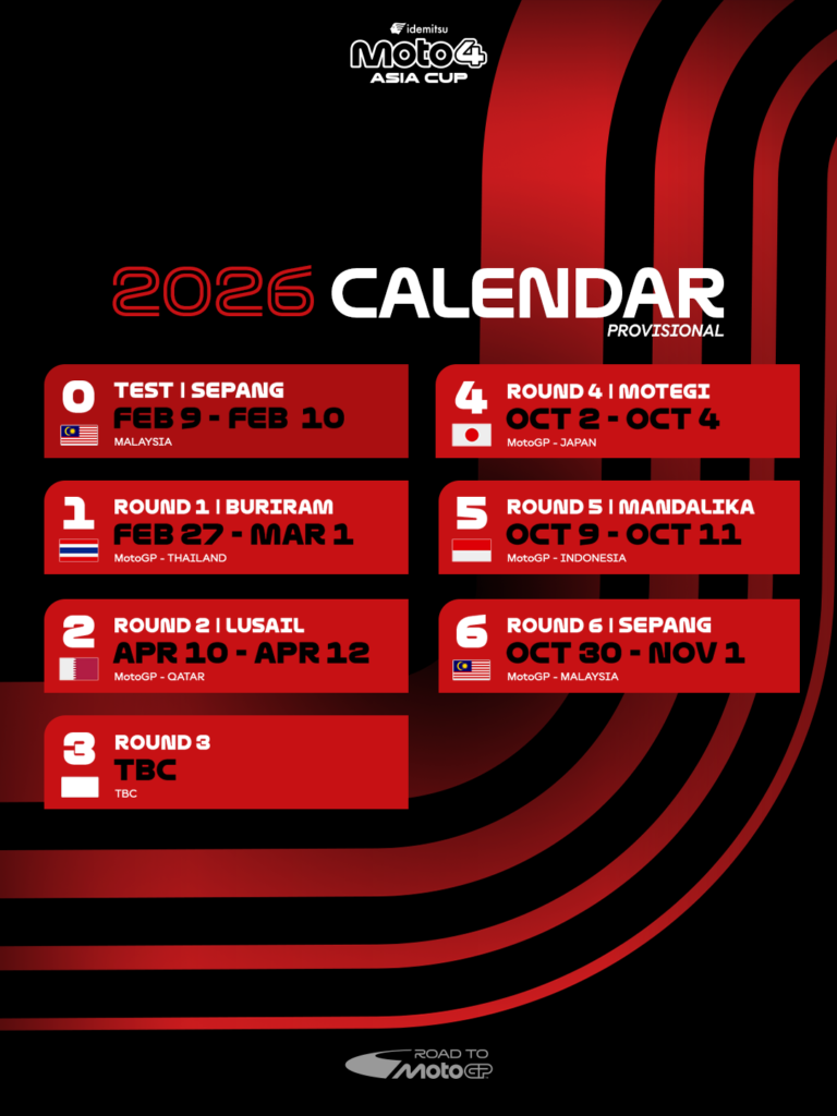 Putaran perdana Moto4 Asia Cup ini bersamaan dengan seri pembuka MotoGP 2026 di Chang International Circuit di Buriram Thailand.Pebalap Indonesia peserta Moto4 Asia Cup 2026 dari entry List Moto4 Asia Cup :