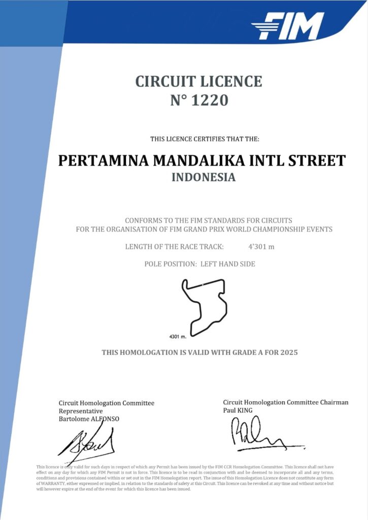 Sertifikasi ini membuat Pertamina Mandalika International Circuit dinyatakan siap menggelar Pertamina Grand Prix of Indonesia 2025 pada 3–5 Oktober 2025, yang akan menjadi salah satu seri utama dalam kalender FIM Grand Prix World Championship.