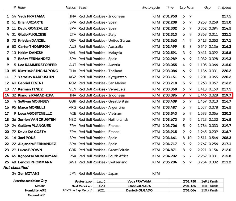 Sebelumnya pada sesi free practice 1 (FP1), MK Ramadhipa terlempar dari posisi 20. MK Ramadhipa berada di urutan ke 22.