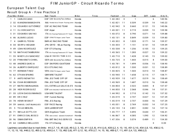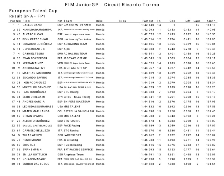 FP1 Ramadhipa mencatat waktu 1: 42.293 detik yang menempatkan diposisi 2. Hanya selisih 0.153 dari tercepat . Posisi 1 FP1 Grub A ETC Valencia Carlos Cano dari UAX SeventyTwo Artbox dengan waktu 1: 42.140 detik.