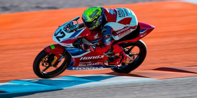 Melesat cepat Muhammad Kiandra Ramadhipa pebalap Honda Asia Dream Racing Junior Team di Free Practice European Talent Cup (ETC) pada FIM JuniorGP World Championship 2025 round 7 di Valencia (21/11).