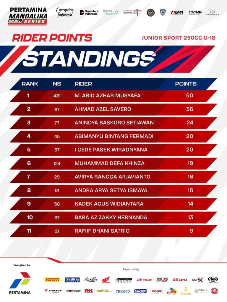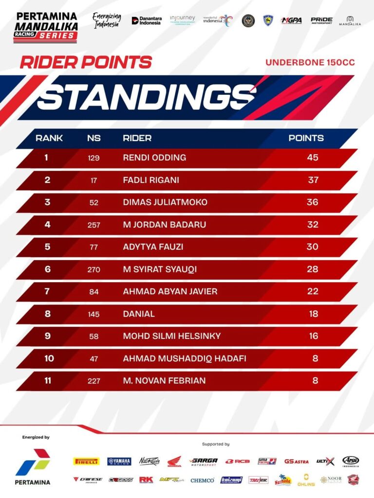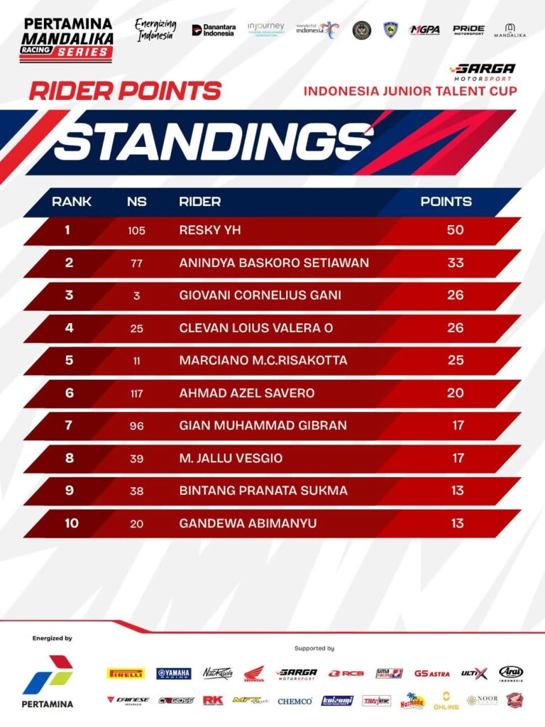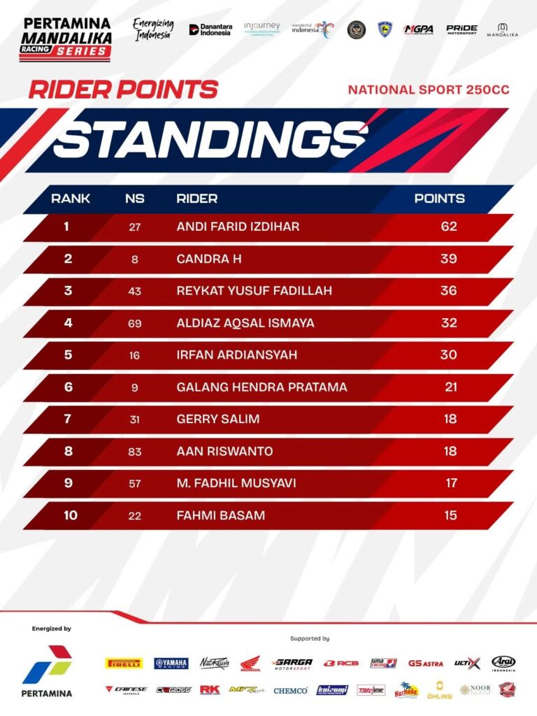 Tiap race di tiap kelas para pemenang telah hadir. Posisi pebalap di standing poin sementara Kejuaraan Nasional balap motor sportbike Pertamina Mandalika Racing Series (MRS) 2026 putaran 1 bisa diketahui.