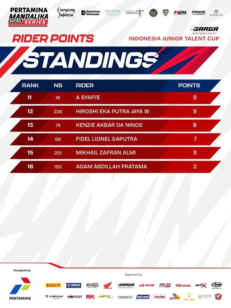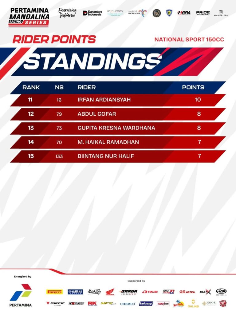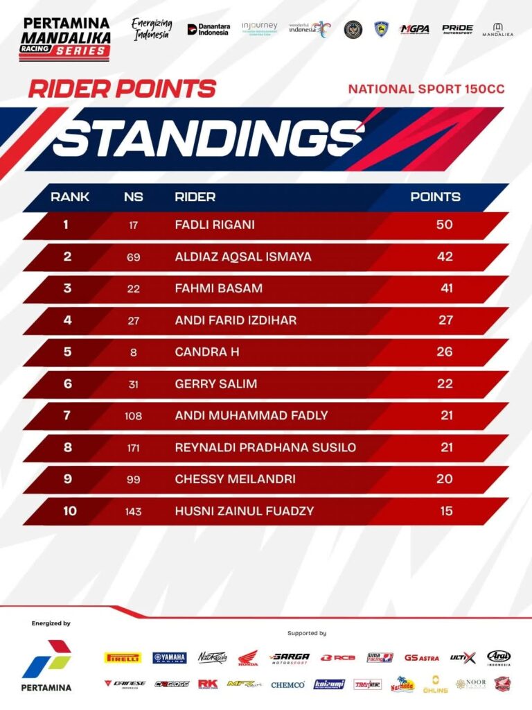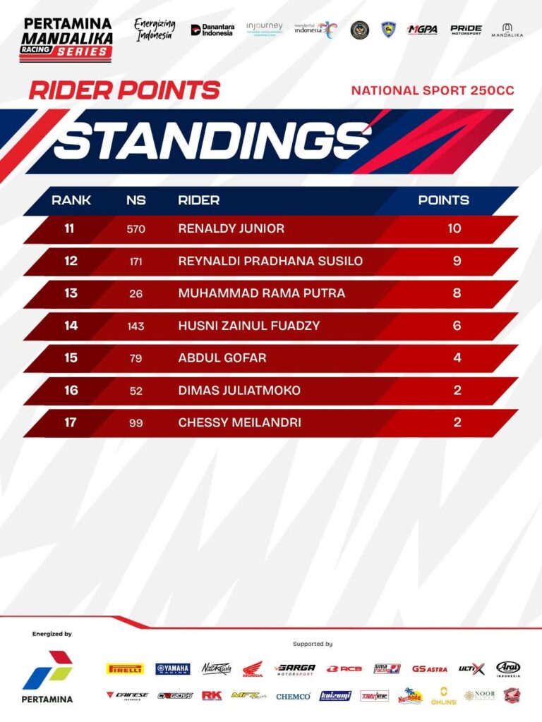 Tiap race di tiap kelas para pemenang telah hadir. Posisi pebalap di standing poin sementara Kejuaraan Nasional balap motor sportbike Pertamina Mandalika Racing Series (MRS) 2026 putaran 1 bisa diketahui.