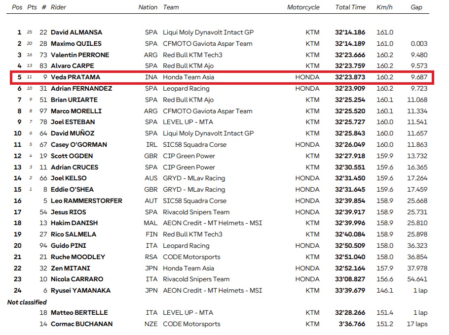 Start dari grid ke 5 hasil kualifikasi yang berada di posisi 5, Veda Ega Pratama pebalap Idemitsu Honda Team Asia ini langsung melesat bertarung di barisan depan. Veda yang merupakan Runner Up Red Bull MotoGP Rookies Cup 2025 ini berada di posisi 6 lap pertama.
